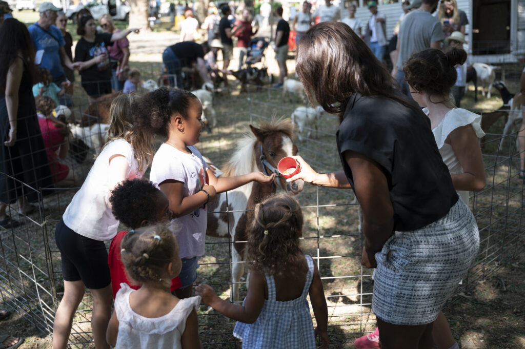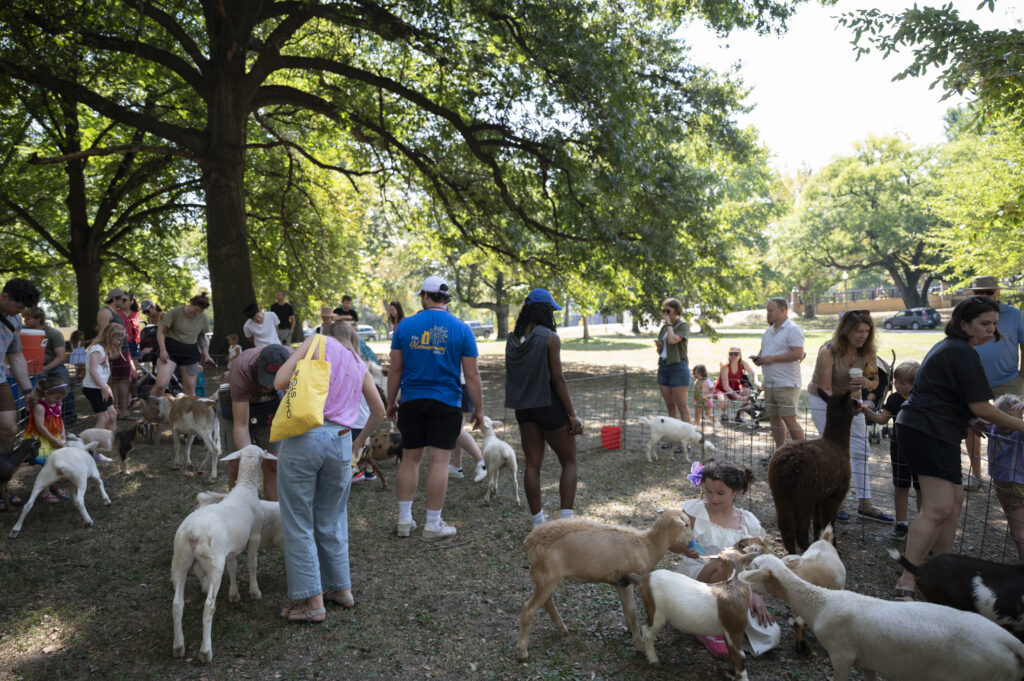Families visit the Barn Yard Petting Zoo at the Pittsburgh County Fair on Sept. 13, 2025. Credit: Mars Johnson