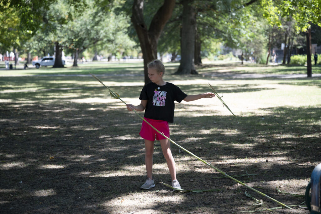 Anna Miller, 10, peels sorghum at the Pittsburgh County Fair on Sept. 13, 2025. Credit: Mars Johnson