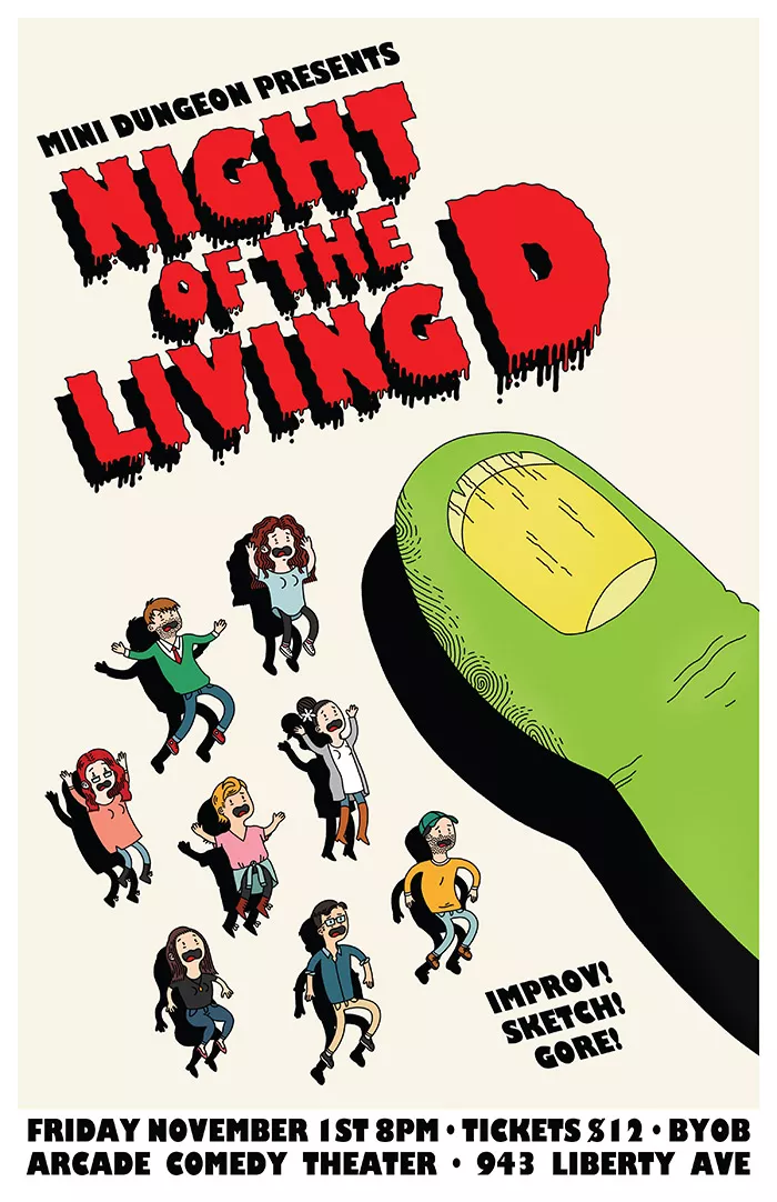 “I had to run back to the office, panicking about all that yogurt and hot dogs going off,” she says. (Check this story to read up on what hot dogs she’s referencing; and yes, if you’re curious, they’re still in there.) The fun five-minute film will be featured during the troupe’s horror-themed variety show Night of the Living D at 8 p.m. on Fri., Nov. 1 at Arcade Comedy Theater. The night will also include sketch comedy, long- and short-form improv, games, and some additional interactive bits, according to Norton. The designer also created the artwork for the event poster: an amazing illustration of an oversized zombie thumb about to crush minuscule cartoons of all eight comedians.
