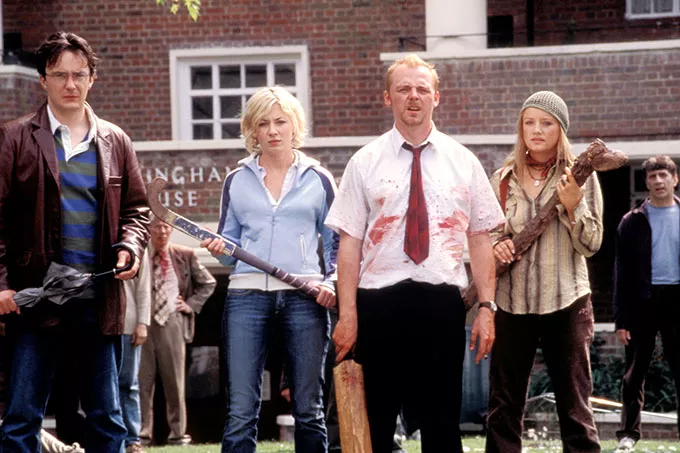 Shaun (Simon Pegg) works at an electronics store and dates Liz (Kate Ashfield), who’s at the end of her rope with his inability to shape up and start treating their relationship like an adult. She still hasn’t met his mum (Penelope Winton); he spends his non-work/non-romantic life getting stoned and playing video games with roommate Ed (Nick Frost), apparently the only man in London less acclimated to adulthood than Shaun. Their other roommate, Pete (Peter Serafinowicz), has a job and car; Liz’s friends David and Dianne (Dylan Moran and Lucy Davis) prefer the opera to chugging cigarettes and downing pints at the local pub. Liz gets fed up after Shaun forgets their anniversary and calls things off. If a breakup can’t get him to grow up, maybe a breakout of zombies can.