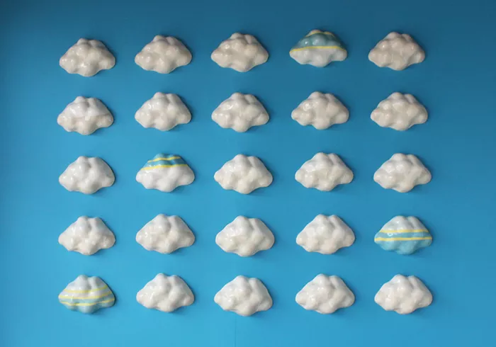 I’ve made a ton of clouds! Too many to count in different iterations and materials. The main clouds exist in glazed ceramic forms. That was a big project for me during graduate school to create 50 ceramic clouds for a wall installation. The interesting dichotomy of these clouds is their weight of them. They are fragile but hold a permanent shape and live in this state of soft hardness, and they are the same every day. They refer to a postcard image or snapshot of a beach sky. If you reference anything in ceramics, you automatically add longevity to it, even if naturally it shifts and moves as clouds do. I like the permanence of fired clay.