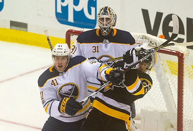 Matt Hunwick battles with Buffalo Sabres Johan Larsson on Sept. 27 at PPG Paints Arena. Credit: CP photo by Vincent Pugliese