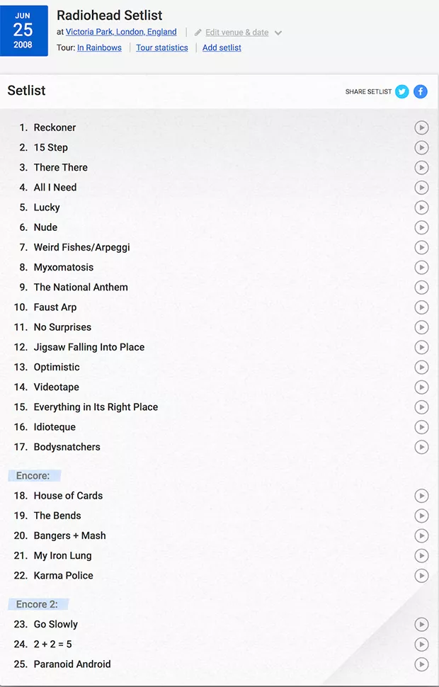 Then on June 25, 2008, I was leaving my classroom in London and saw a piece of loose-leaf paper hastily pinned to a bulletin board which read, “RADIOHEAD TICKET, TONIGHT, £90,” and a phone number. It was the In Rainbows tour. Victoria Park, which is like London’s Central Park with classier pigeons. It was eight hours before the show.