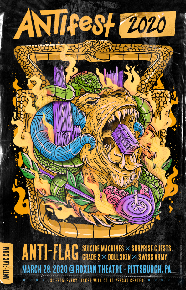 On the lineup for ANTIfest 2020 is Anti-Flag is Detriot punk-rock band Suicide Machines, English band Grade 2, Phoenix-based Doll Skin, and Pittsburgh’s own Swiss Army. Two other special guests are to be announced at a later date.