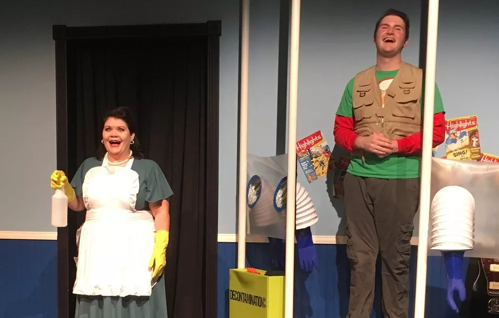 Directed by Don DiGiulio, the first big musical production from Arcade Comedy Theater stars Nathaniel Yost as Jimmy, an immunity-deficient young man living in a protective bubble (his catchphrase is “A single germ could kill me”). He seems content to be stuck in his bedroom with his overbearing, judgmental mother (played with crazed gusto by Missy Moreno) until bad girl Chloe (Alex Manalo) moves in next door. Sweet, innocent Jimmy strikes up an unlikely friendship with the new girl, which eventually blossoms into love. When Chloe runs off to marry Mark (Noah Welter) at Niagara Falls, Jimmy decides it’s time to create a mobile version of his bubble and hit the road to stop the wedding. From there, the show becomes an unstoppable force, with cast members dancing, singing, and running on and off stage at a feverish pace, all to live music by Joseph P. Stamerra’s three-piece band.