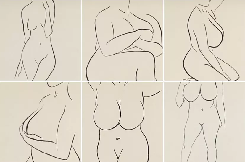 The portraits resemble the simple, fluid forms of Henri Matisse, capturing the bodily outlines of women in various poses. Some are more detailed, with exposed nipples added, while others feature arms crossed over breasts, or more posed similar to a boudoir photo shoot.