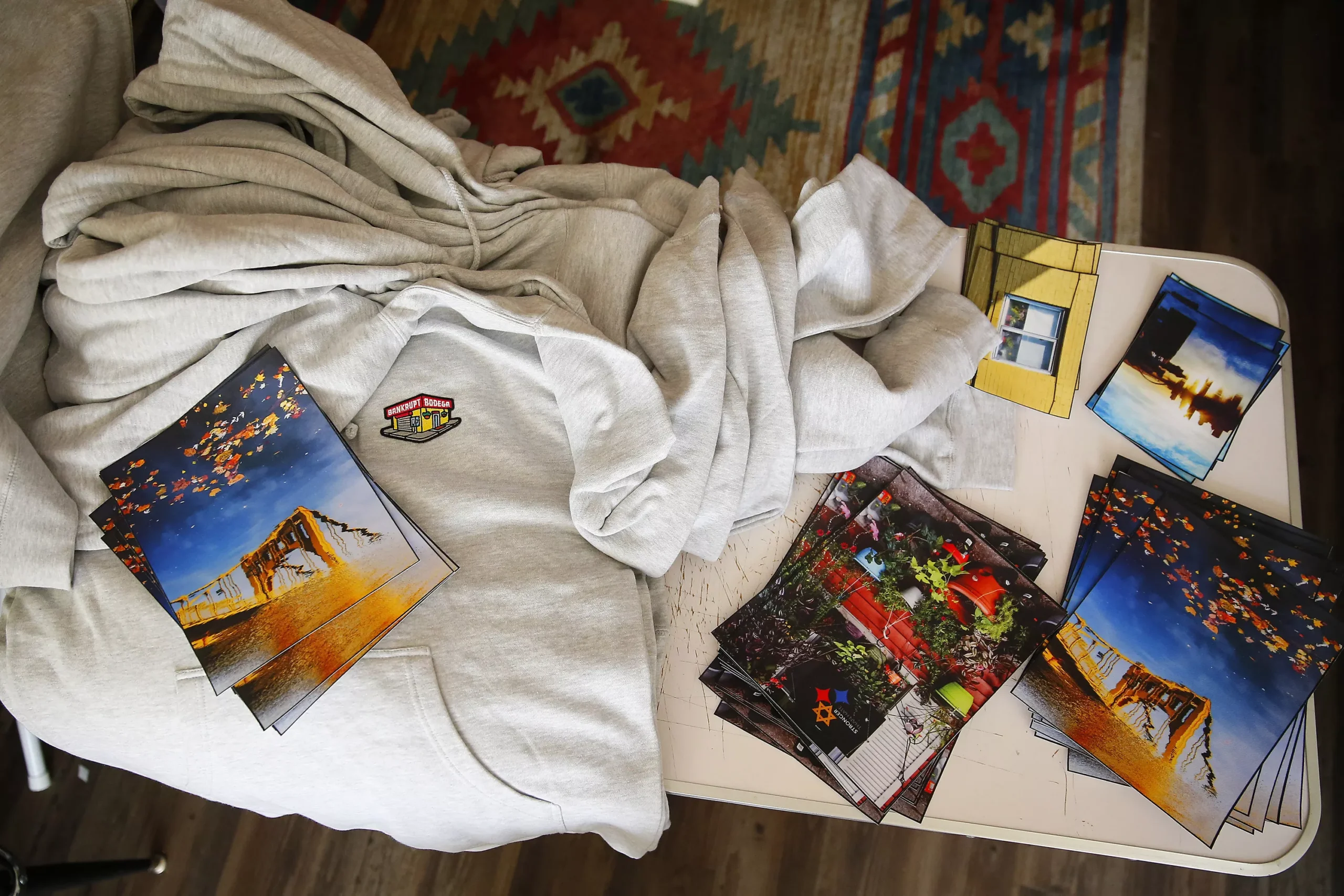 His photographs, tying in with the Bodega’s vintage theme, are framed inside of old windows salvaged from Pittsburgh-area homes. If customers are out of wall space at home for a framed print, Bruener also stitches his photographs on to many of the vintage clothes and custom sweatshirts for sale in the shop, including an old Marlboro cigarette jacket.