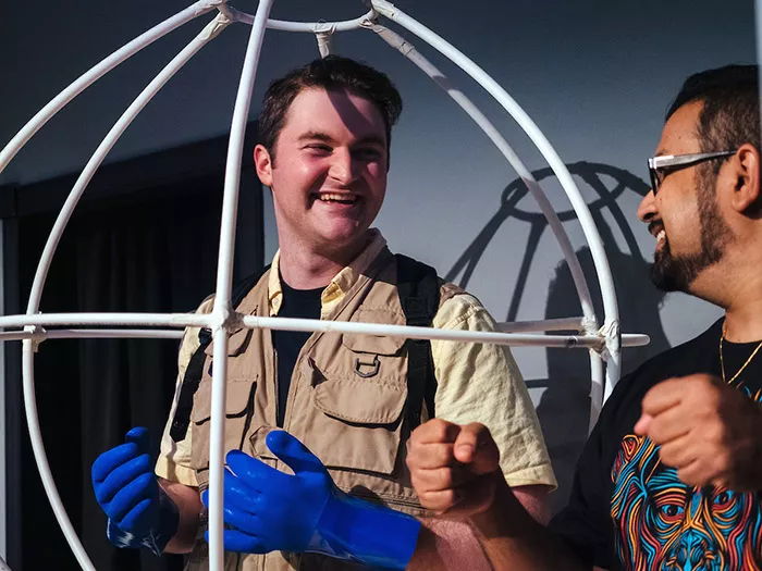 To pin down some of the more technical aspects of the production, Arcade relied on the art skills of its regular performers, mainly in making a bubble suit in which Yost would still be able to move, sing, and dance. For that design, Sarah Wojdylak — with help from fellow performers Anna C. Reilly and Bob Rudenborg — employed flexible PVC pipe and the clear, plastic zipper bags used to package bed sheets, and attached thick gloves to dryer vent tubes to serve as the arms.