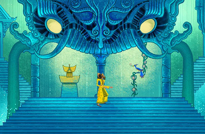 An animated still of a person in a bright yellow outfit looking at a peacock perched on a vine.