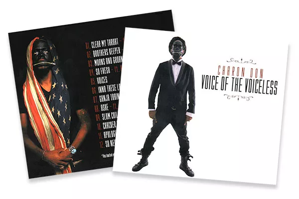 Album art can often be tangential, an afterthought — once the album is complete, the musician does a quick photo shoot, or commissions an abstract painting. But for ChaRon Don, the artwork on his new album, Voice of the Voiceless, says everything: The Pittsburgh rapper appears in a tuxedo and combat boots, in blackface (he’s African American), with a zipper closed over his mouth. On the inside panels, he’s seen, still in blackface, draped in an American flag, then in garments with the colors of the Pan-African and Ethiopian flags, then, on the back cover, back in the tux, starting to undo the zipper on his face.