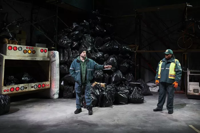 The two maneuver through a sprawling set, designed by Narelle Sissons, gradually loading all of the refuse piled around into the back of one of two garbage trucks on stage. Sissons is especially good at split-level sets, like this one, that offer a cross-section of multiple spaces at once, allowing the stage to accommodate scenes in the garage, on the street, in the truck, and at two nearby businesses without extensive scene changes. (Unfortunately, even so, the production loses momentum in scene changes that last too long.)