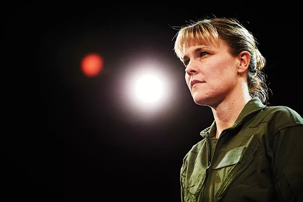 At the top of this one-woman show we meet the Pilot, an unnamed F-16 flying ace. She’s full of bravado, spinning stories filled with the romantic iconography of the fighter pilot — a female version of Tom Cruise in Top Gun.