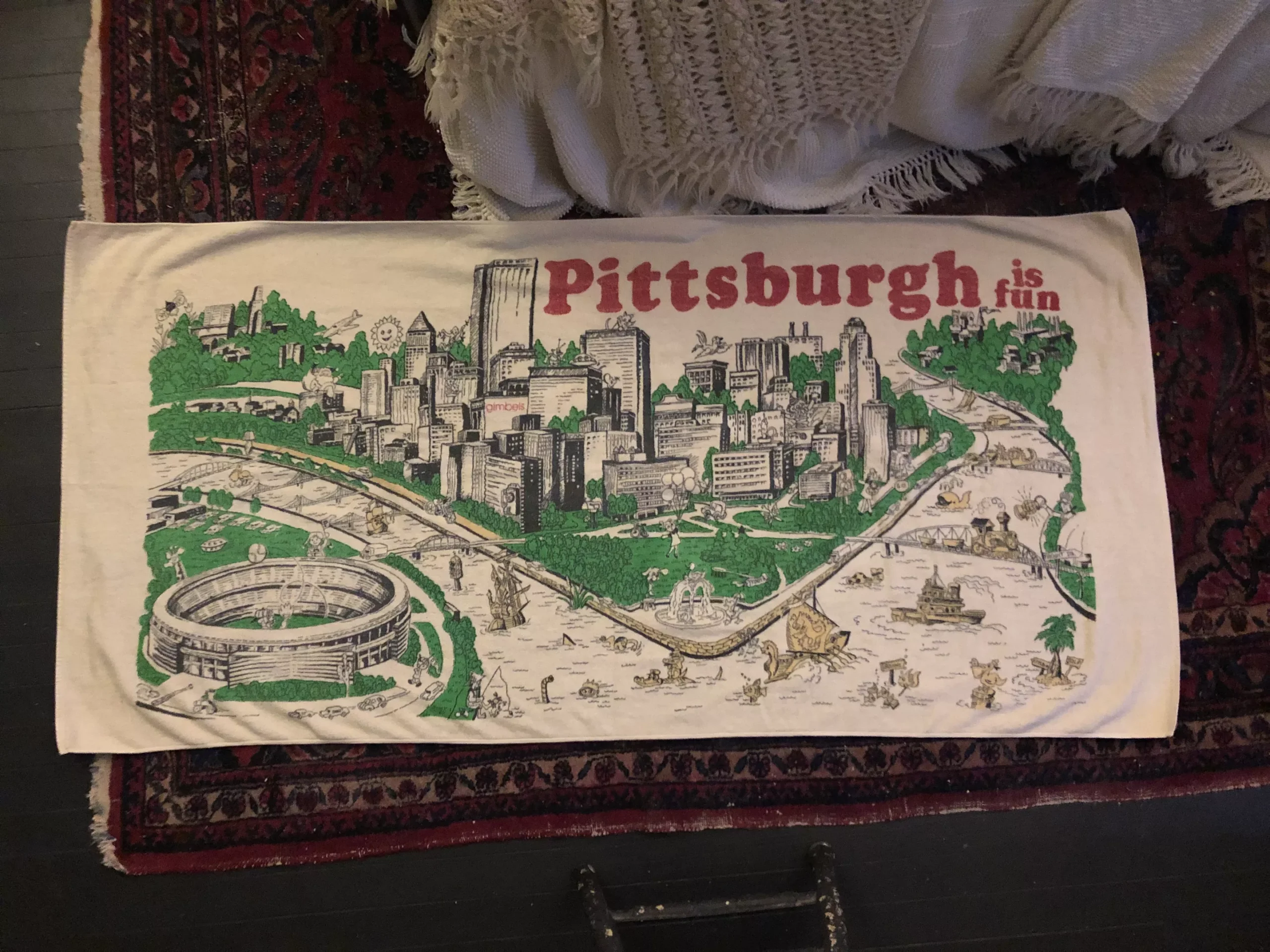 Well, I spend a lot of time at St. Vincent de Paul [thrift store] — these are actually Pittsburgh throw-back Gimbles [trousers] and I just got them tailored to fit a little better. I have this great towel upstairs that my mom almost put in the rag pile. It says, “Pittsburgh is fun” with a cartoon [Pittsburgh] landscape, [and the only building with branding] is Gimbels. If it is on a beach towel, you know it is true. [Laughs]
