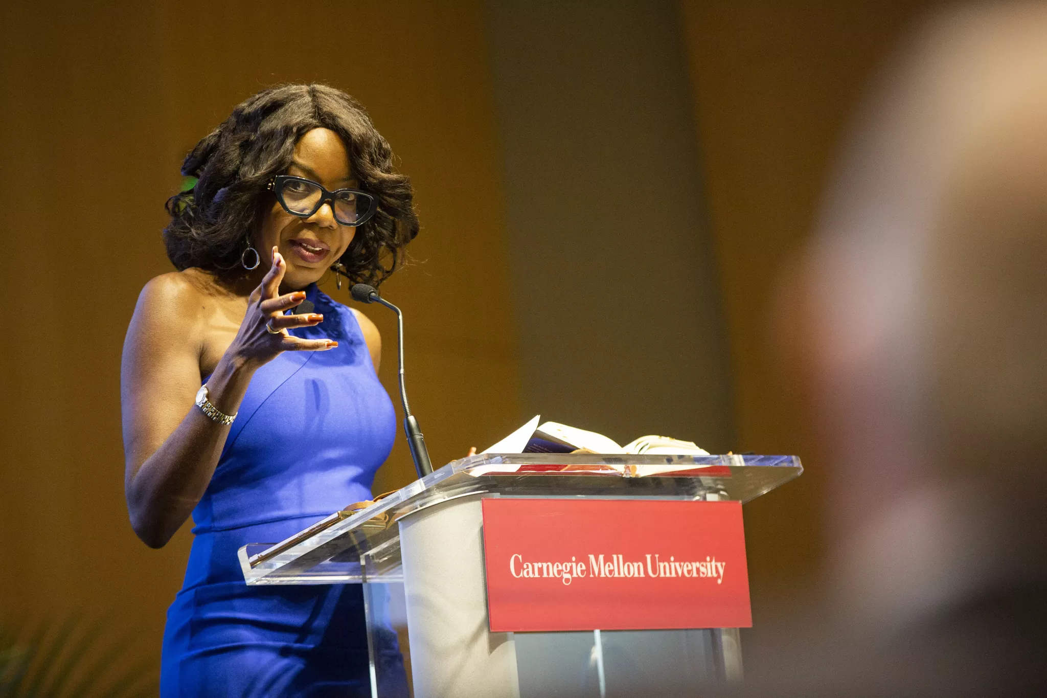 A fit woman in a form-fitting sleeveless dress and glasses gives remarks from behind a Carnegie Mellon University podium