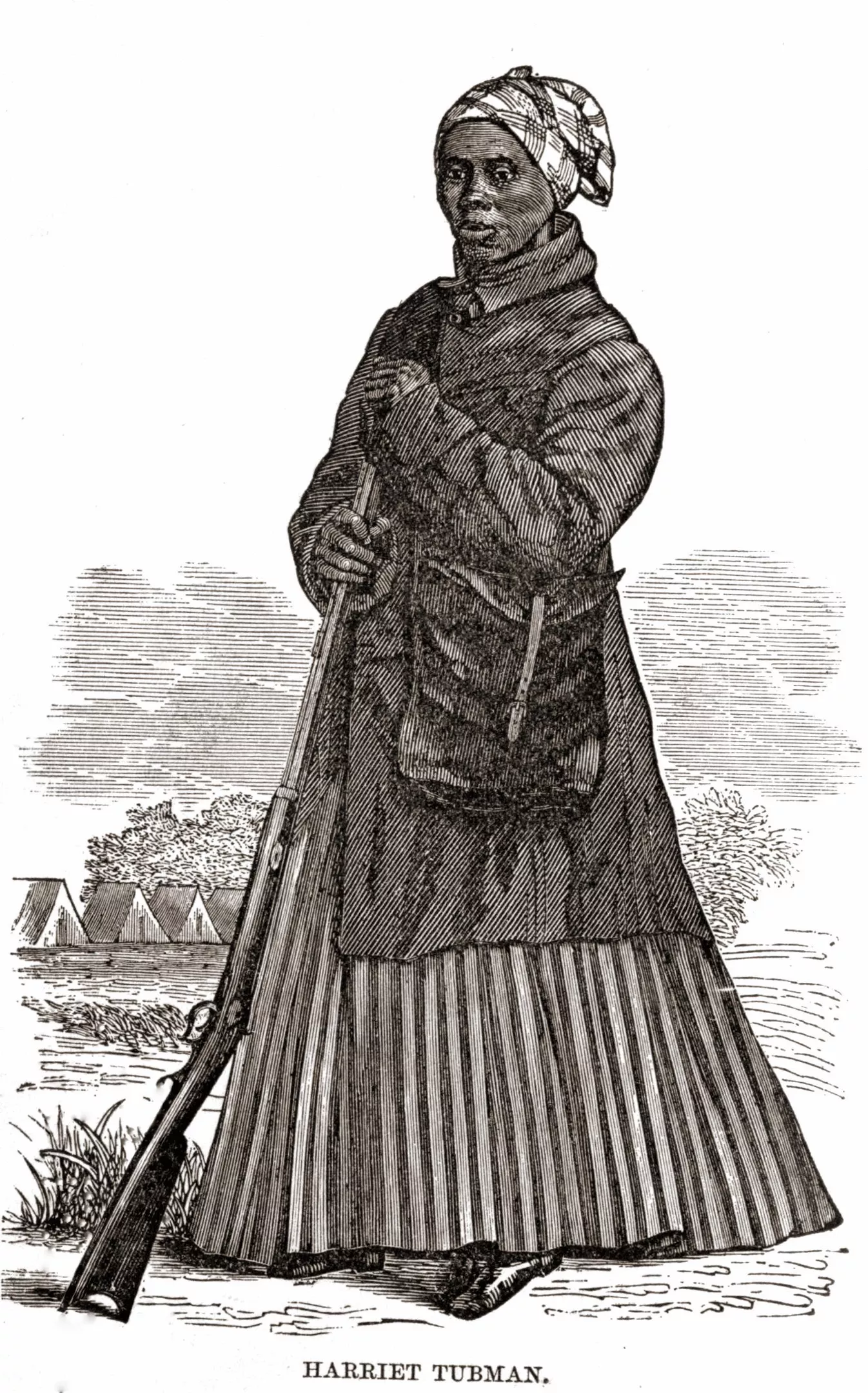 An etching of Harriet Tubman in a practical jacket, headscarf and large flowing skirt holding a rifle