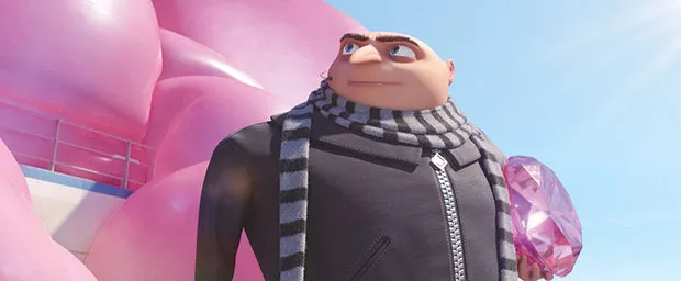 Gru (voiced by Steve Carrell) has lost some of his edge: He’s no longer a bad guy, and is married to Lucy, (Kristen Wiig), an agent with the Anti-Villain League. There’s some plot jiggering to give Gru a purpose: He and Lucy bungle the capture of a crook — washed-up 1980s TV star Balthazar Bratt (Trey Parker) who has stolen a giant pink gem — and get fired from the League. Conveniently, Gru learns he has a long-lost brother, Dru (also Carrell), who wants to learn cool spy-like villain behavior. So Gru trains Dru, and our three heroes work to steal the diamond back from Bratt, a.k.a. commit a crime for good.
