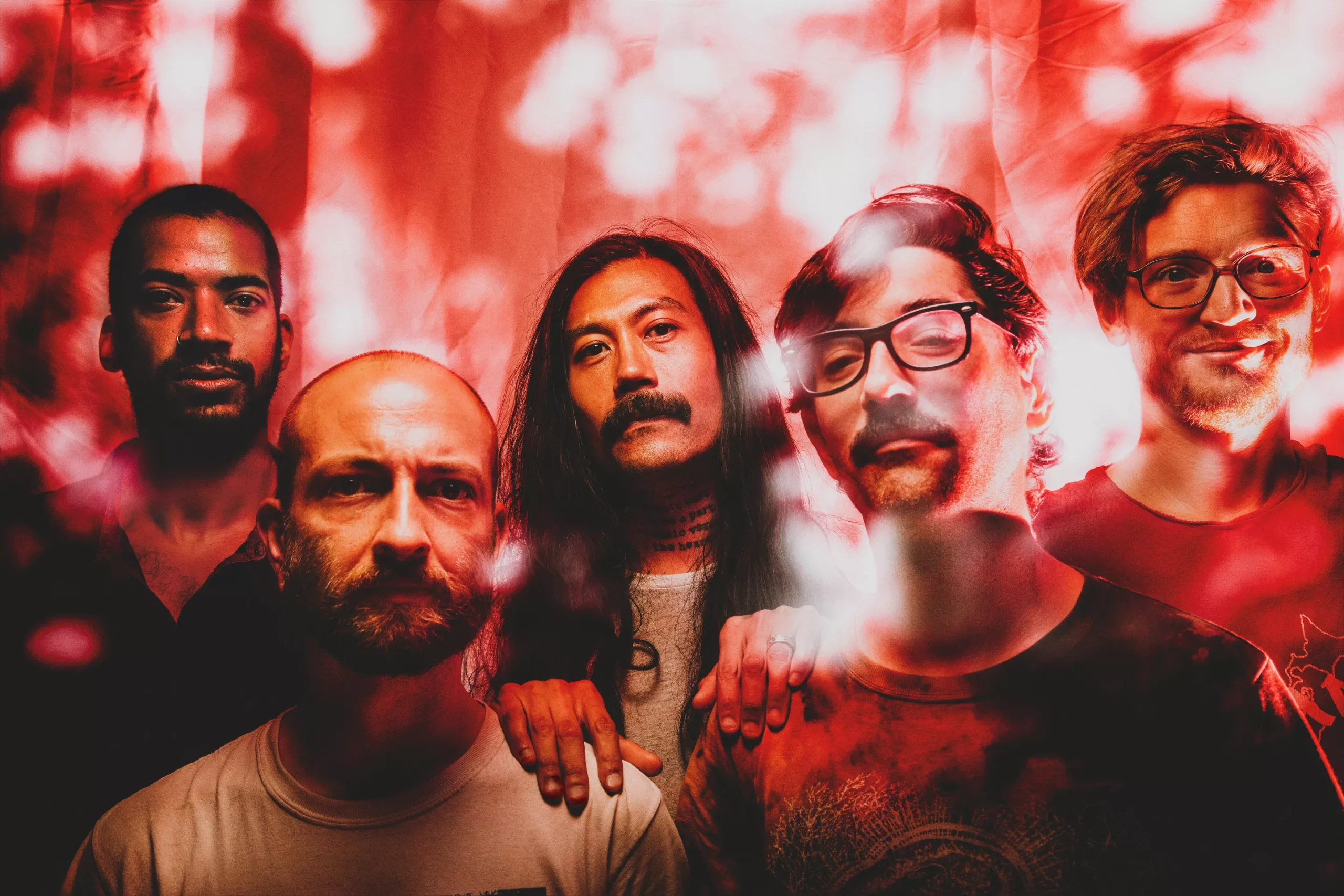 Five band members with different facial hair in a blurry red photo filter