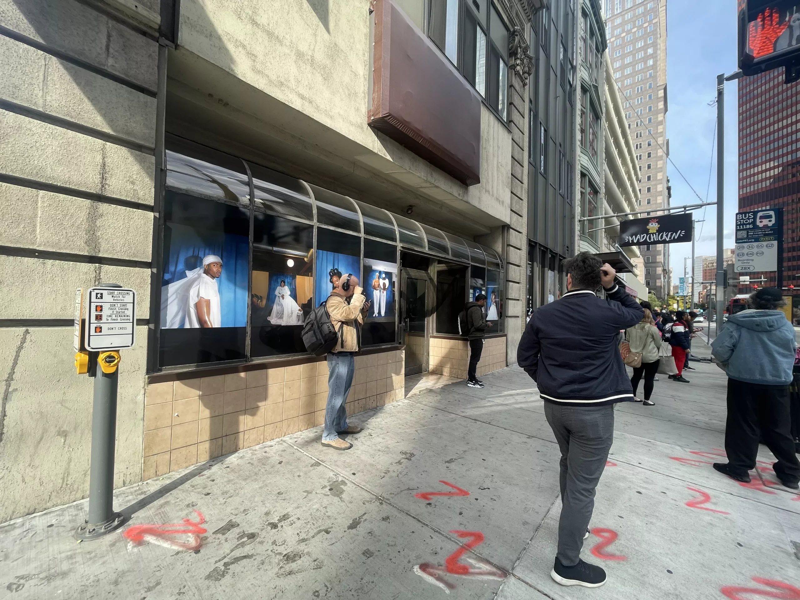 On an average grey weekday in Downtown Pittsburgh, rushed commuters might not give a second glance at empty buildings as they pass. But a new art installation aims to change that, bringing vibrancy and color by displaying the work of three Pittsburgh artists on the windows of vacant storefronts on Liberty Avenue.