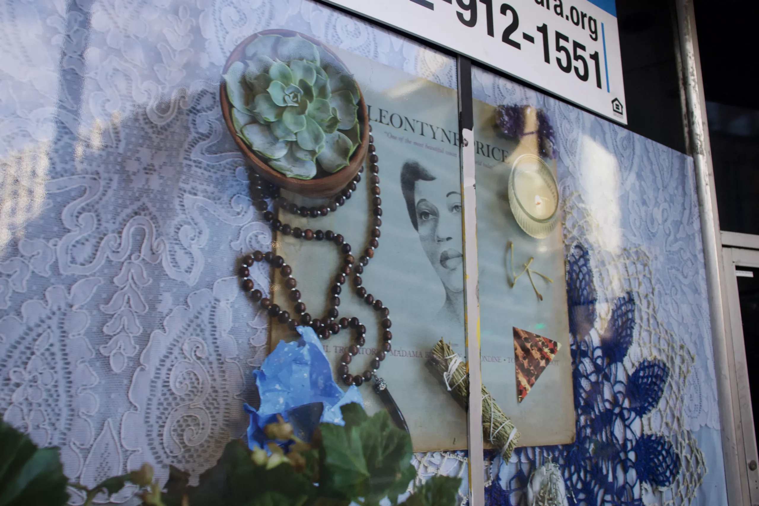 Emerging Visions wades into a jumble of signifiers about Pittsburgh’s past and present. The Kinsel work — an intimate domestic scene featuring a Leontyne Price record, lit candle, and sage bundle — appears directly beneath a for sale sign at the historic 604 Liberty building, previously a deli, a newsstand, a cigar-rolling facility, and an unrealized taproom before becoming vacant. Ahmad’s naturalistic work — displayed at what was once an America’s Best Contacts & Eyeglasses discount store — sits among posted signs warning against trespassing and a Downtown “If You See Something, Say Something” campaign.