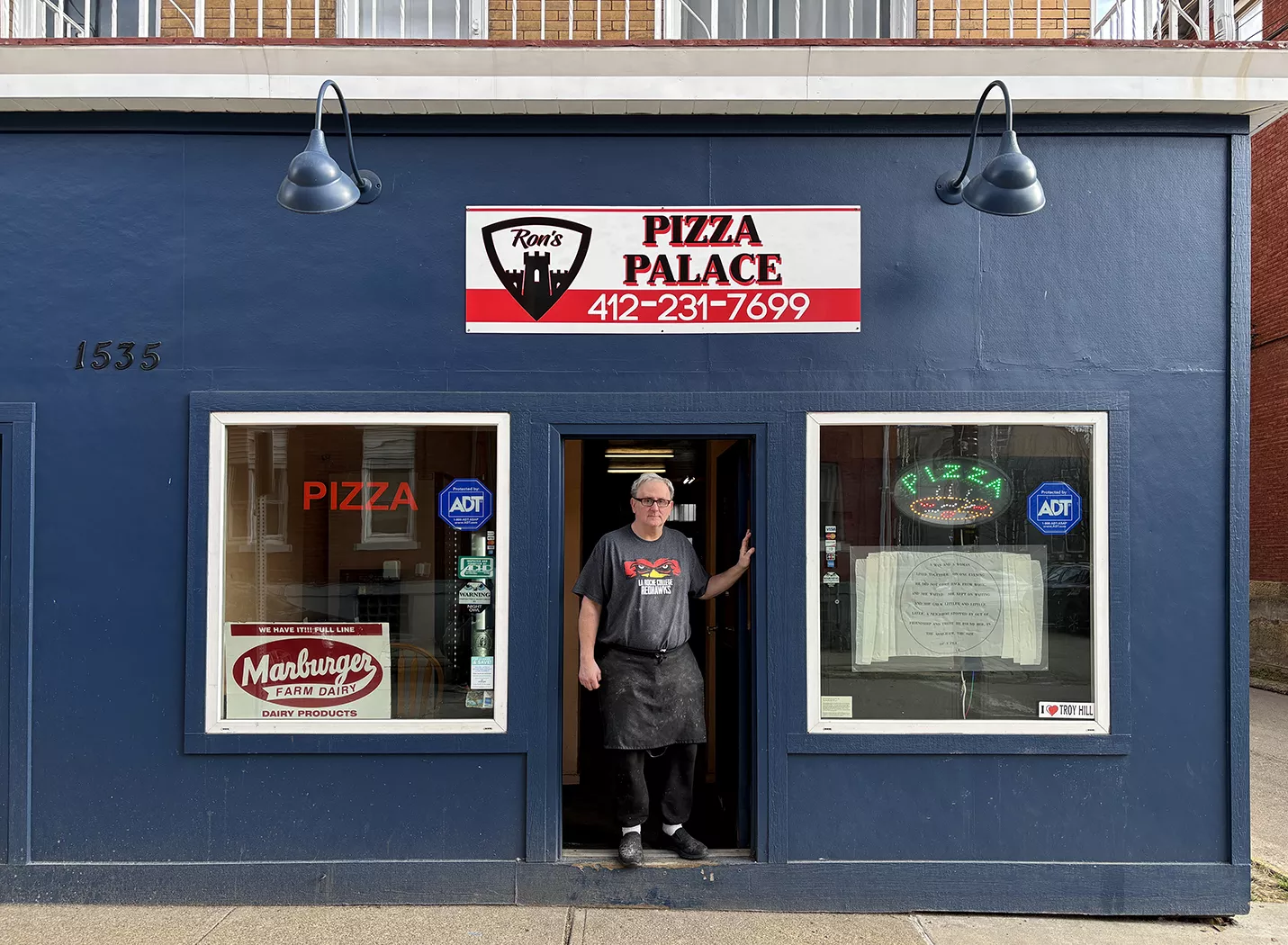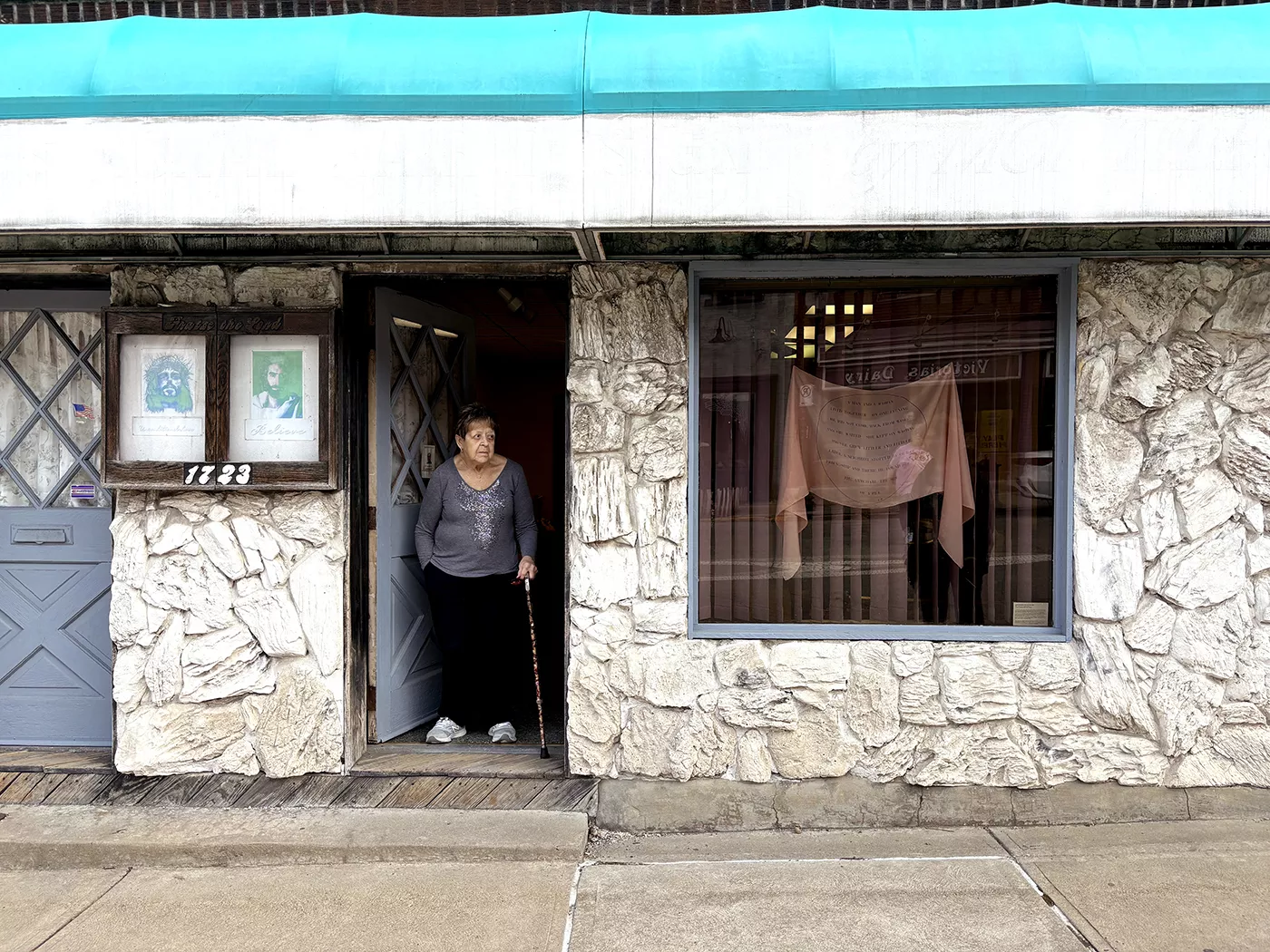 A scarf by artist Louise Bourgeois hangs in the window of Ron’s Pizza Place as part of Exhibition Copy Credit: Photo: Courtesy of Gallery Closed