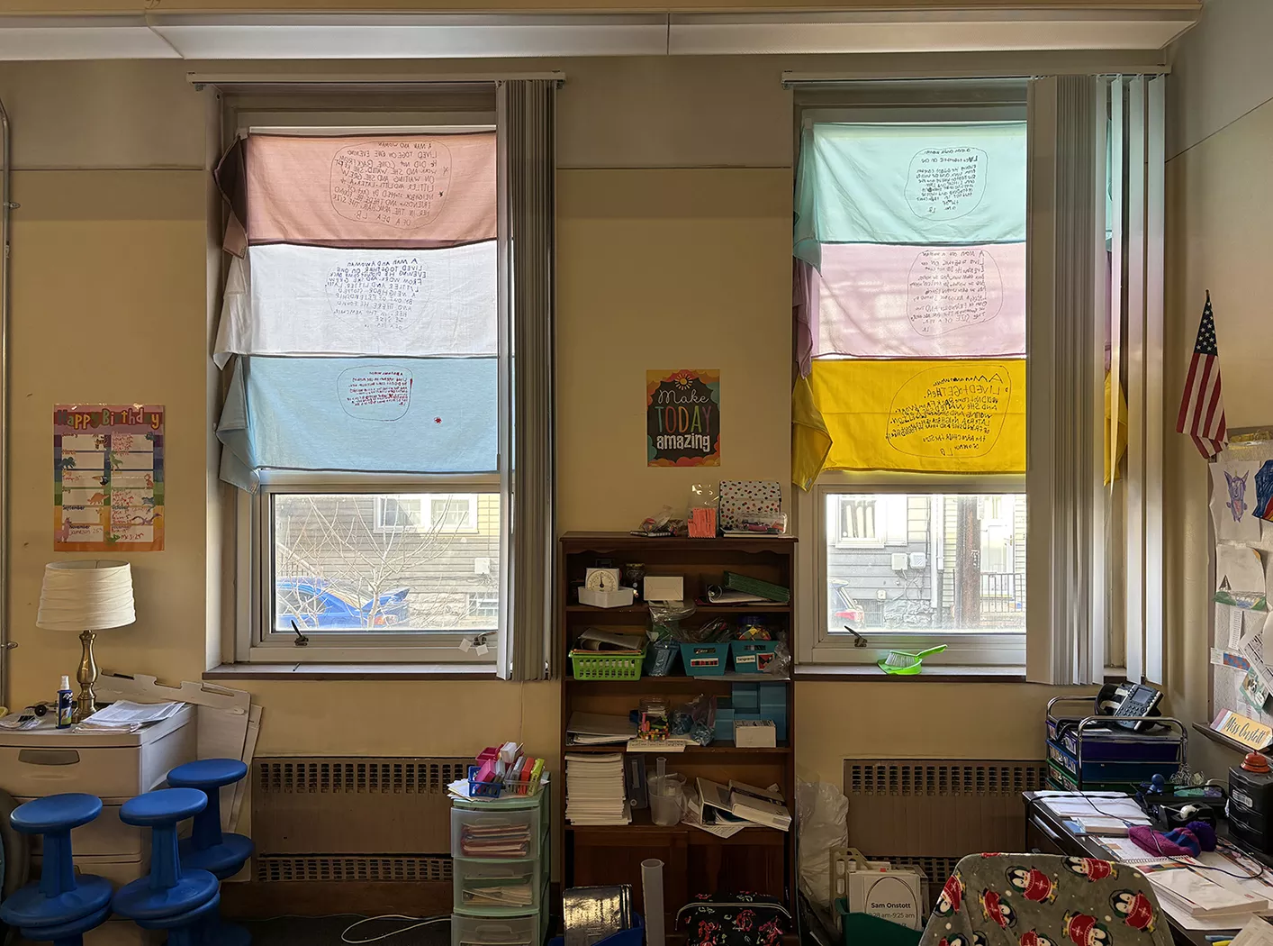Provident Charter School, an institution dedicated to children with dyslexia, features several replicas of the scarf, all hanging from classroom windows, made by third-grade students. The Provident scarves are the same scale as the original, using its template as a model, but each piece remains unique to the student artist who created it. On fabrics similar to the original, the text is handwritten, sometimes with personal embellishments such as hearts or stars, or blotches from where a marker rested on the fabric in a contemplative hand.