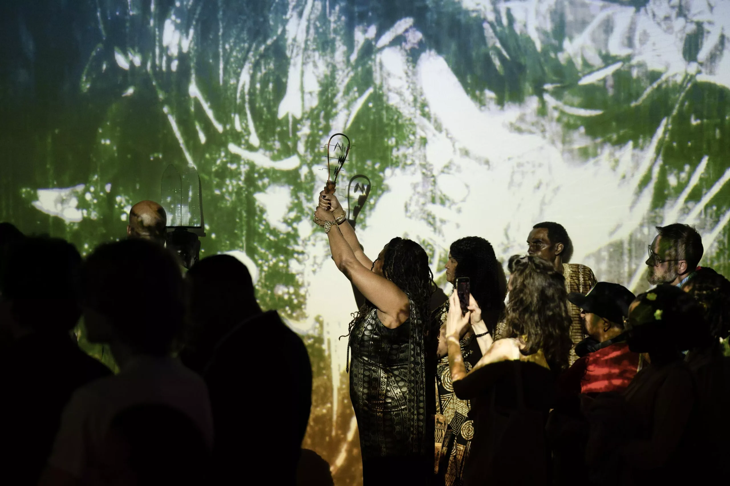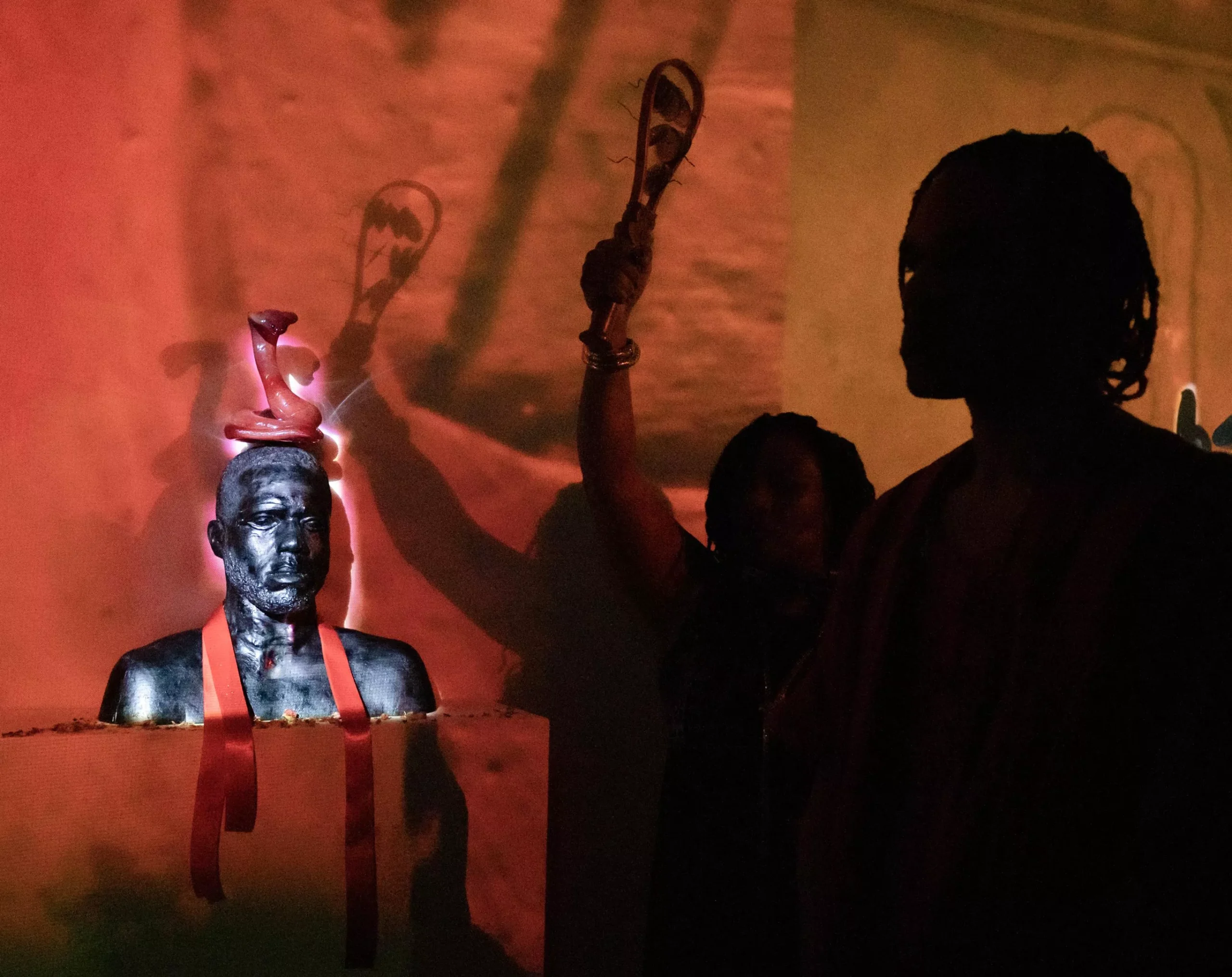 Ursula Payne and Mikael Owunna perform “Opening the Mouth”, a site-specific ritual to animate and enliven the deity statues during opening night of Myth-Science of the Gatekeepers at the Pittsburgh Glass Center. Credit: CP Photo: Mars Johnson