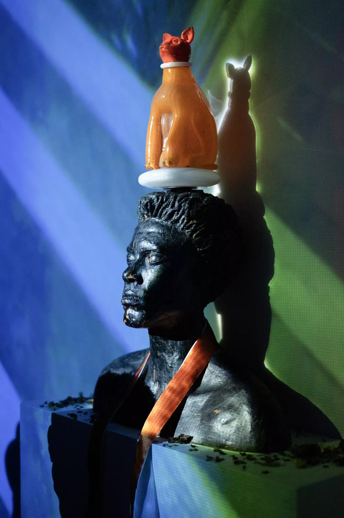 “In each of the figures, we’re re-articulating a Black, queer cosmology,” Owunna explains. “Within ancient Egyptian cosmology, each of the neteru represented different aspects of the biological system and the universe. So each of the figures is also a larger spiritual map for the cultivation and elevation and divinization of Black queer individuals. We see this really as being one of the first, or the first (potentially) Black queer spiritual system and map that’s being presented here through the work of the sculptures.”