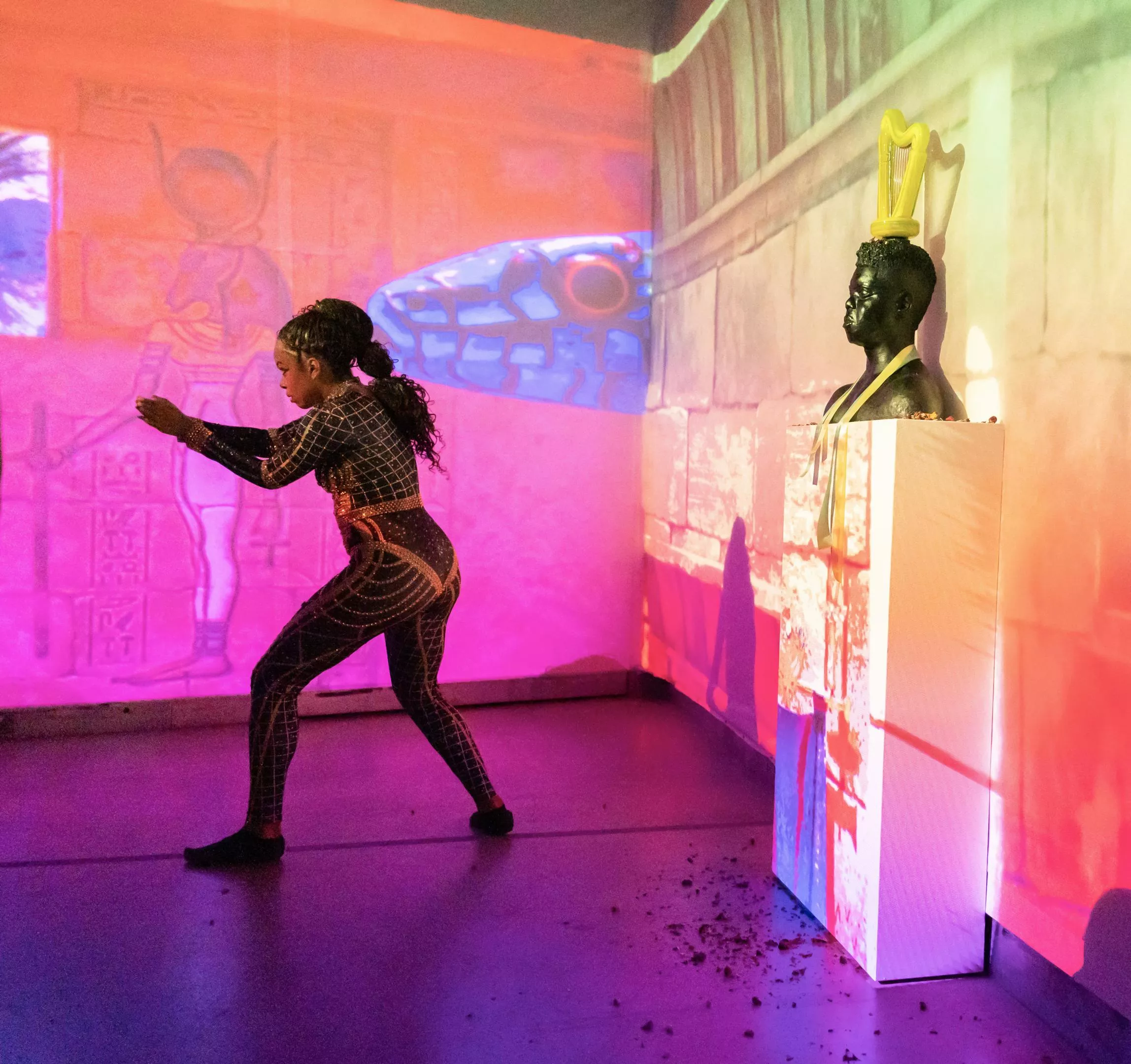 The exhibition kicked off on May 3 with an opening reception that complemented the show’s mission of centering Black, queer culture and experiences, as well as the show’s Egyption influences. Among the festivities were a site-specific dance performance, a poetry reading, and a screening of Blackstar Sanctuary, an immersive virtual reality film co-directed by Redd and Owunna. Also included were Knowing the Evolutions of Ra, a live music performance co-composed by Jaronda Primrose and Redd, and a chance to view the Sovereign series from Granville Carroll, a self-described “contemporary visual artist and Afrofuturist” from Phoenix, Ariz.