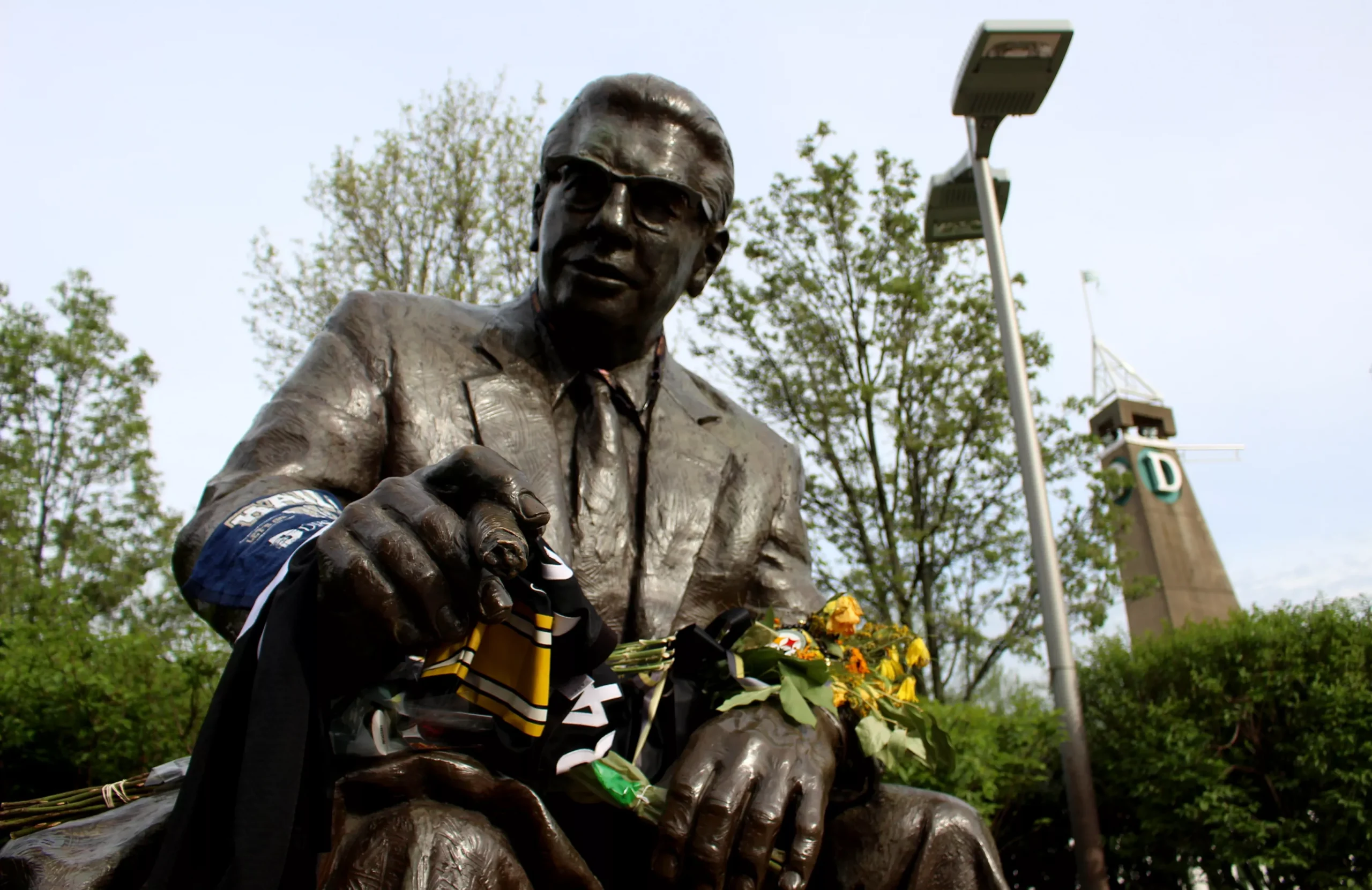 Attendees exited the stadium through Gate A, along Riverfront Park, and walked to the statue memorializing Dan Rooney’s father, former Steelers’ chairman Art Rooney. His signature cigar remained between his fingers, but his arms now held bouquets of flowers, Pittsburgh collegiate memorabilia and a Steelers jersey.