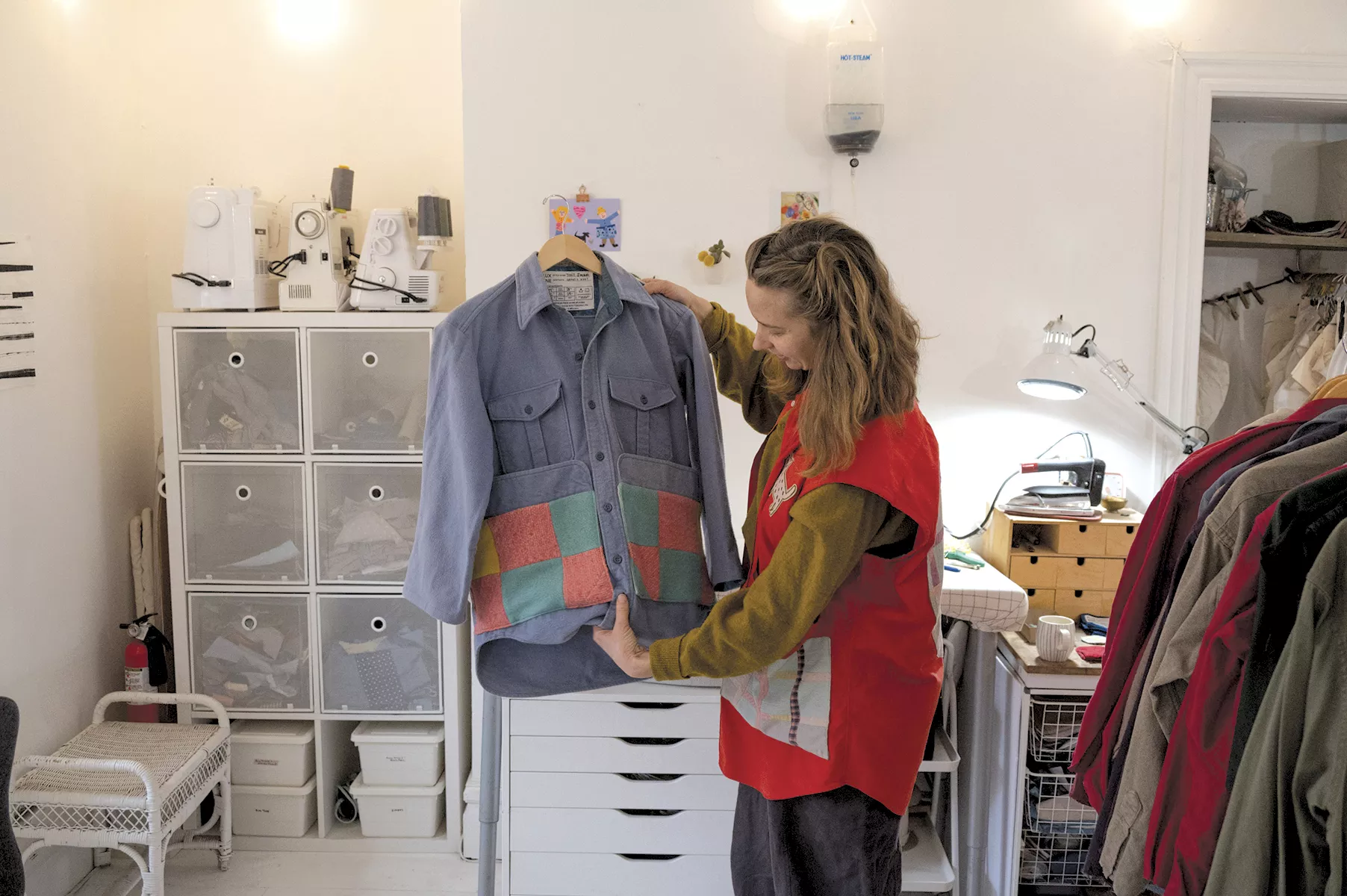 The process to create a Flux Bene piece starts with sourcing used garments from thrift stores or online secondhand markets. Joy looks for clothes with small imperfections that are about to be discarded. She also sources fabric from many different places, such as Fab Scrap and the Salvation Army’s biannual fabric sales. The only new material she uses is American-made muslin for the garments’ hem tape and tags.