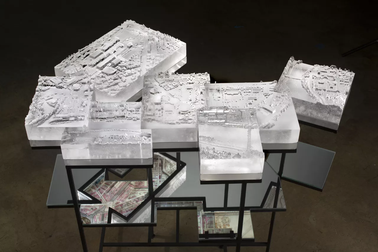 One of the biggest and most visually captivating pieces is a 3D map of Lowell, Mass. by Norwood Viviano, from his Mining Industries series. Viviano pieced together maps and aerial photos of Lowell and employed LiDar (Light Detection and Ranging) technology to punch data points into a 3D modeling software to create a model of the town.