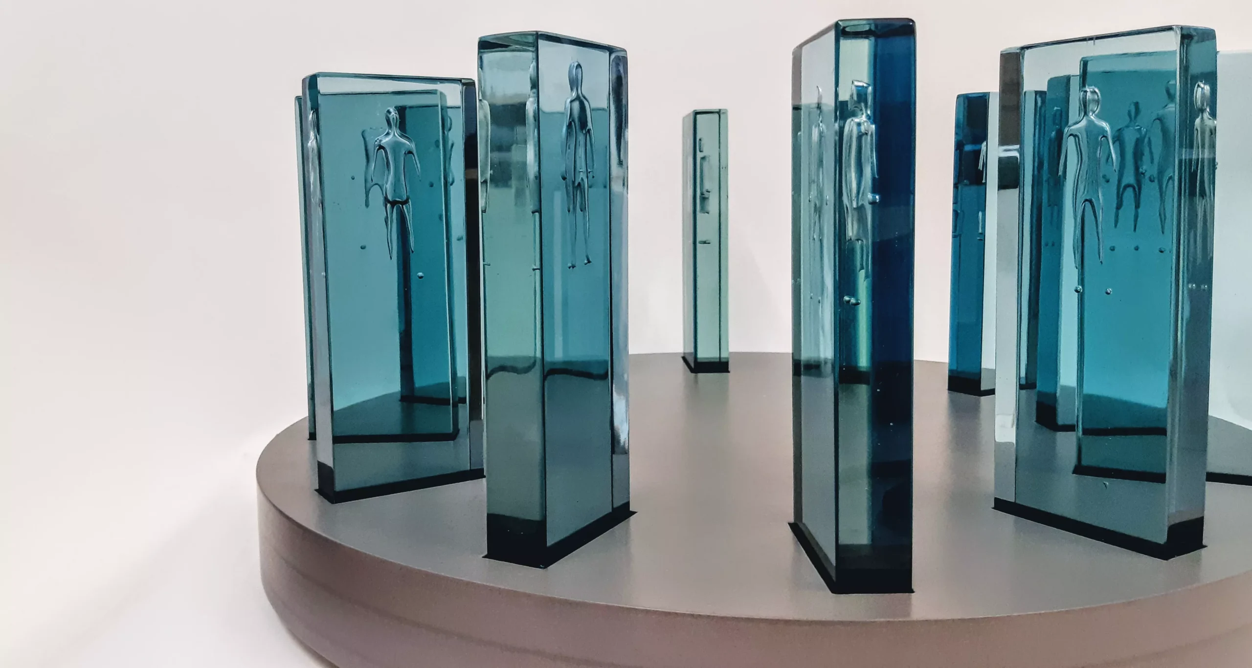 Two artists in the show, Joanne Mitchell and Vanessa Cutler, both based in the U.K., use waterjet cutting to create their work (high-pressured water used to cut material instead of another tool that generates heat). Mitchell’s piece features “controlled air bubbles” to create tiny human figures trapped in glass blocks. “The embodied air proposes that we are here then gone – perhaps leaving a trace. The forms have both physical presence and absence,” Mitchell writes in her artist’s statement.