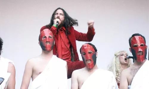 No, it’s not the Polyphonic Spree. If anything, Flaming Fire, a New York apocalyptic-cabaret supergroup, is the exact opposite: a red-clad horde sent to banish any mellow vibes such a namby-pamby group might have left behind from its show the previous evening. (Ahem!) They’re the Jonestown answer to the Danielson Famile, the Mansonic answer to The Winans — and the retort to any other uplifting, clap-your-hands gospel outfit you can name.