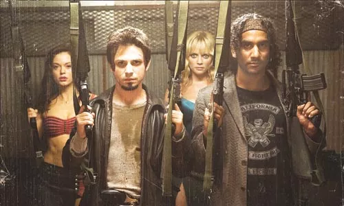 Rodriguez, who’s been splitting his work between blood-soaked kill sprees (Sin City) and flashy kiddie fare (Spy Kids), unspools his B-movie first: Planet Terror, or one night of zombie trouble in the hills outside Austin, Texas. A plucky gang, led by a stripper (Rose McGowan) and her ex (Freddy Rodriguez), hunker down at a BBQ joint to coordinate headshots. Planet is sprinkled with recognizable faces — Lost‘s Naveen Andrews, Black Eyed Pea Fergie, Bruce Willis, Tarantino and Pittsburgh’s own zombie-flick special-effects master emeritus Tom Savini.