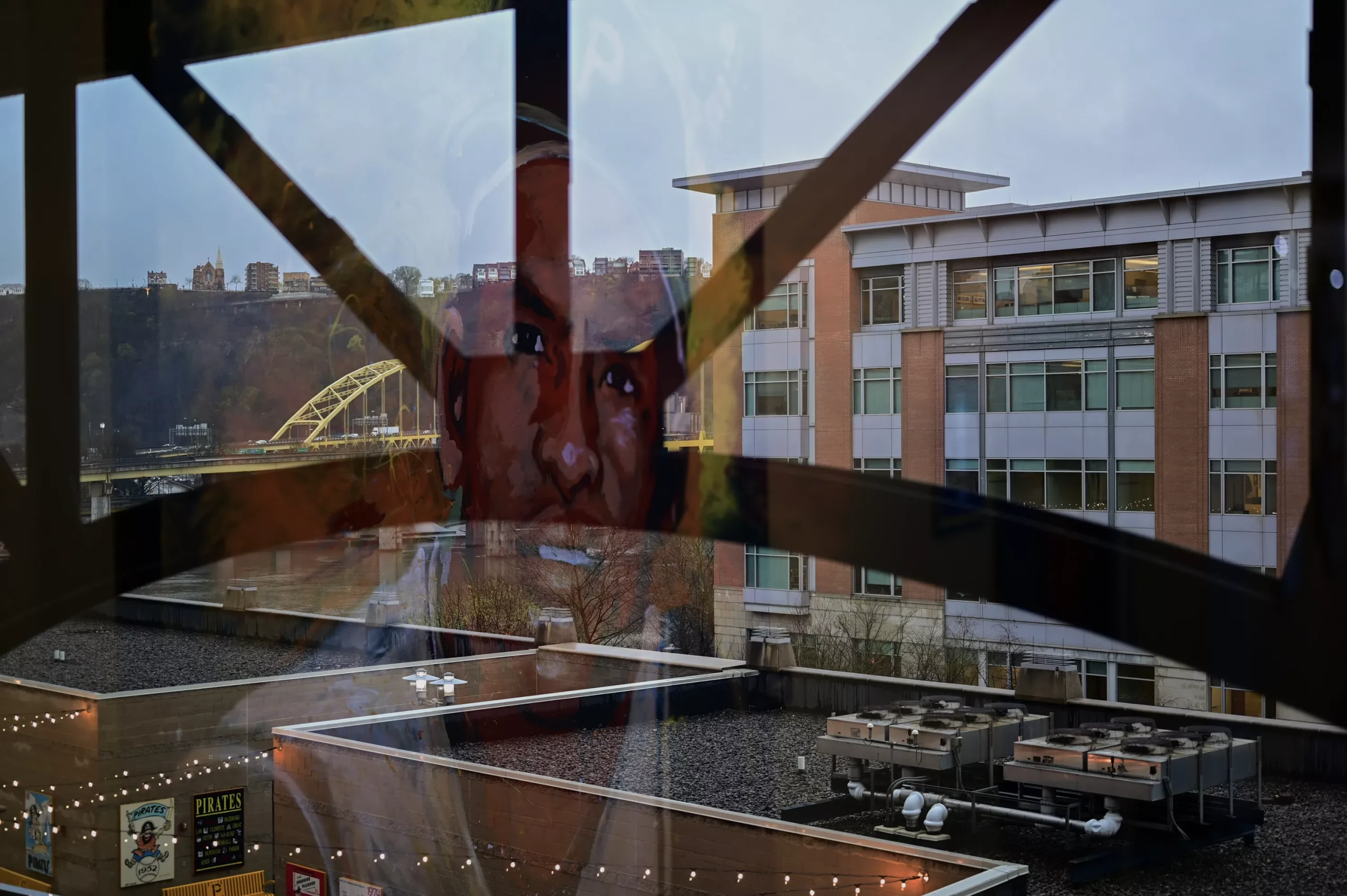 A painting of Roberto Clemente seen at PNC Park. This image was made using an in-camera double exposure technique. Credit: CP Photo: Mars Johnson