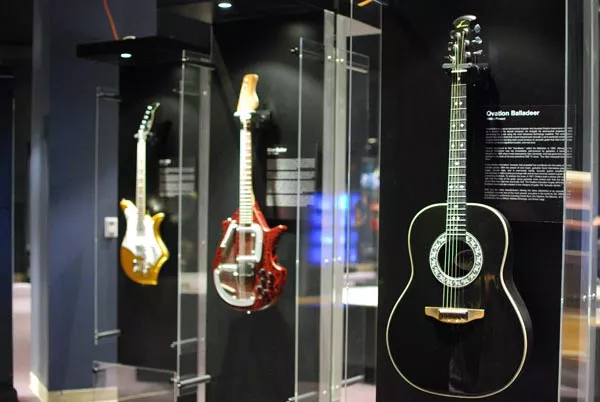 On loan from the National Guitar Museum, it features 60 guitars, plus interactive displays, videos and the world’s largest playable guitar, a 43.5-foot-long, 16-foot-wide Flying V. Guitarist Dave Wheeler — of the local, heavy, ’70s-blues-riff-zillas Carousel — joined me for an early look.