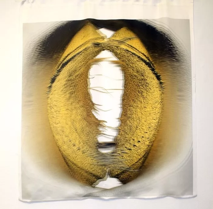 Flaherty, a Pittsburgh-based Deaf artist, and first-generation Filipino immigrant, contributes pieces from her Anthropology of Motherhood project, described as an “ongoing curation of artwork and design that engages in the complex visual, material, emotional, corporeal and lived experiences of motherhood, care-giving, parenting, nurturing and maternal labor.” For the work on display here, Flaherty started with a flatbed scanner to capture the form of unusable breastmilk. The results take two forms: four images magnified and mounted on silk and three 3D-printed objects.
