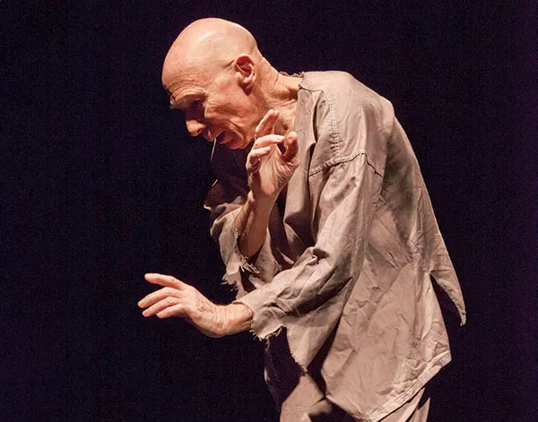 Thompson is well known on local stages, and his résumé in mime and movement theater reaches to Broadway and Europe. He’s a wonderfully expressive performer; at times, evoking pain on stage, he can seem to shrink before your eyes. Mason matches him with a vocabulary drawn more from contemporary dance. The cast is completed by Alexandra Bodnarchuk, who embodies the menacing (but also unnervingly sensual) predator, and Ryan Bergman, who portrays a third victim. (Bodnarchuk and Bergman also team up for an interpolated commedia dell’arte pantomime about a soldier and a poor man that comments on predation in economic terms.)