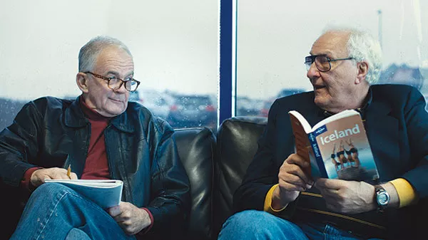 Mitch (Earl Lynn Nelson) is a garrulous, up-for-a-laugh retired surgeon from Kentucky, and Colin (Paul Eenhoorn) is a quiet, slightly depressed fellow, long ago from Australia. The pair are ex-brothers-in-law, having been married to sisters, but now both are alone, and lonely. Mitch forces Colin to accept his gift of a trip to Iceland — seemingly chosen at random — and they’re off!