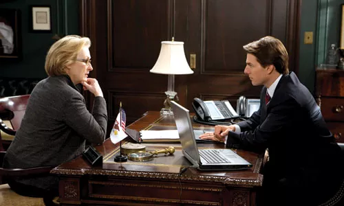 All of this of course is highly contrived, as fable and metaphor must be. For a while I bristled at its cowardice: Why did they create fictional characters instead of naming names (although Cruise is Gumped into photos with Bush and Condi)? Why didn’t they call people out, rather than creating a roman-à-feet-of-clef? But then it occurred to me: This movie doesn’t want to explicate the past. It wants to rewrite the future.