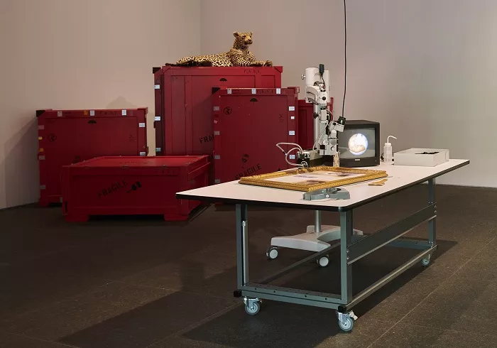 An Art Nouveau-inspired painting titled “Kaleidoscope” comes with gold-lined ears and bold primary colors in an abstraction of shapes that resembles an elephant. There’s a leopard, borrowed from the adjoining Carnegie Museum of Natural History, perched on stacked crates. There’s a bookcase filled with real and fake crystals, artifacts, and other objects. In the center of the room is the empty working station of a questionable presence – a possible art forger.