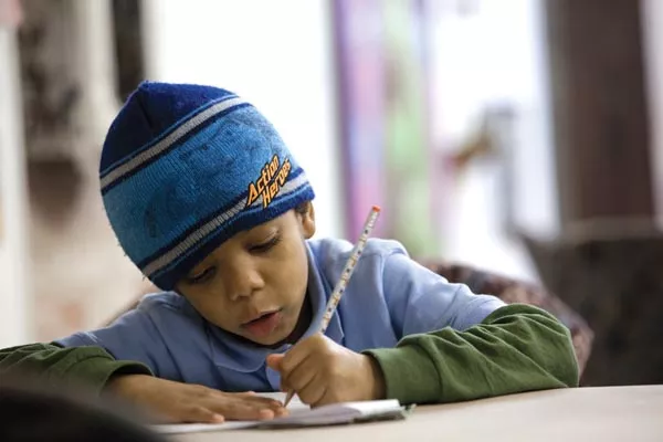 While kids from any community are welcome, most who have visited so far are from surrounding neighborhoods. At one I attended, in December, Levin hadn’t finished chalking the blackboard that advertises the two-hour open house before R.J., 10, had snuck up behind her and tickled her. A Garfield local, R.J. attends Arsenal School and has been coming for homework help consistently enough to have a rapport with the volunteers. After completing The LAB’s weekly writing prompt, he attempted to charm his way out of doing his math homework so he could paint the mural in Assemble devoted to expressing “Why I love Garfield.”