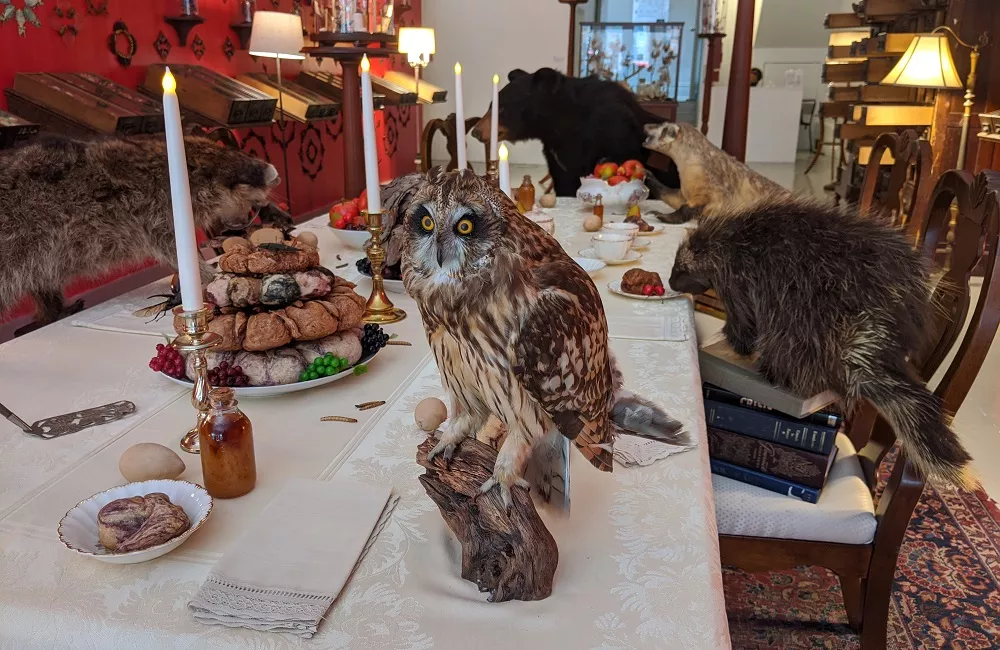 Using specimens from Trundle Manor, the Carnegie Museum of Natural History, and individual donations, the show — which MF interim executive director, Hayley Haldeman, says took three weeks to put up — is all pulled together by magenta walls bursting with circular and skull formations made of pinned cicadas, weevils, and small beetles. At the center of the room is a table set for a party of stuffed native Pennsylvanian wildlife, including a bear, owl, and porcupine, stuck forever in mid-dinner conversation.