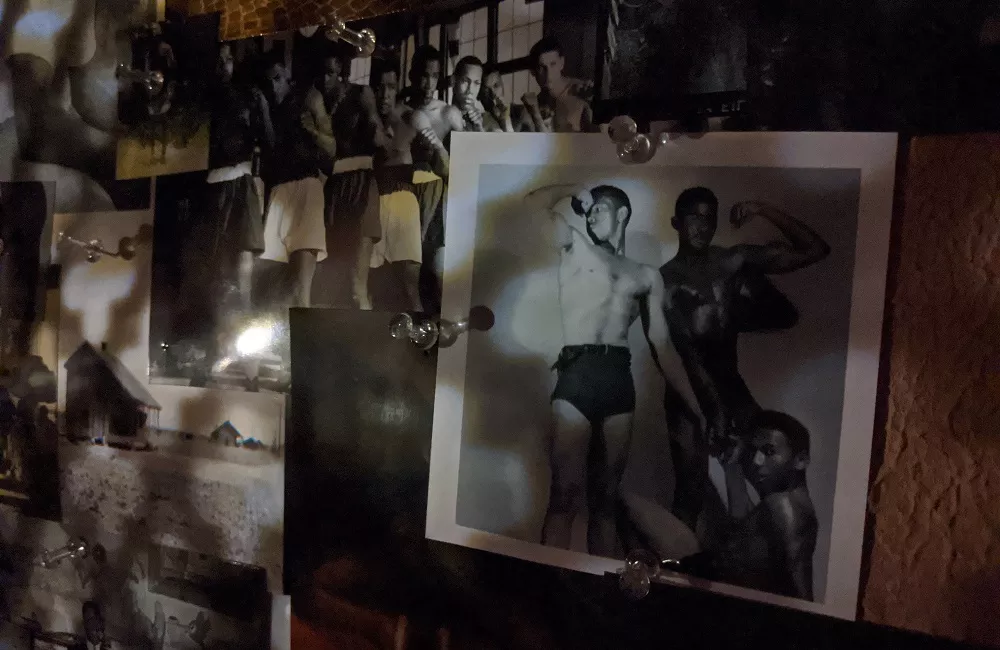 In the confessional, some photos depict more traditional masculine images of Black men in performative boxing stances or flexing, while in another, a man poses in a dress and slingback shoes, smiling widely at the camera. These contrast sharply with one of an older Black gentleman in period clothing, his eyes rolled far back into his head, his mouth agape, serving as a chilling reminder of the horrors, both past and present, inflicted on Black Americans.