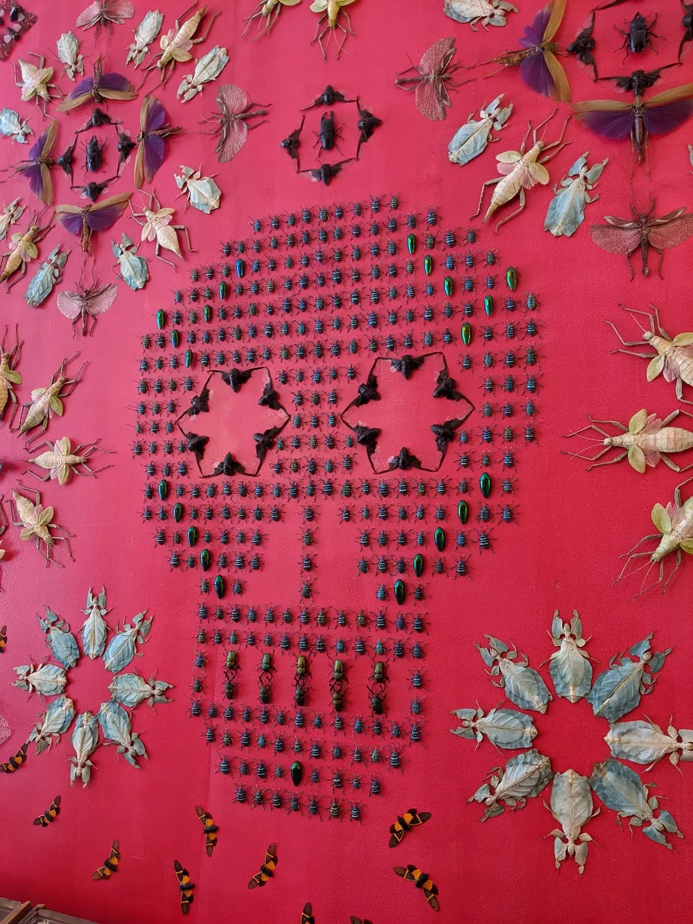 Surrounding them is a dizzying array of microcosmic scenes trapped beneath delicate glass domes or in the small, rectangular drawers of antique storage cabinets. The latter depicts little narratives, with a variety of insects playing out stories of war, worship, and pleasure, all intricately detailed and accented with dried flora and found objects like cake toppers, Monopoly pieces, and dollhouse furniture. The stories they tell range from the haunting to the winkingly absurd, including one box where a group of bugs admires their own displays of impossibly tiny, pinned butterflies.