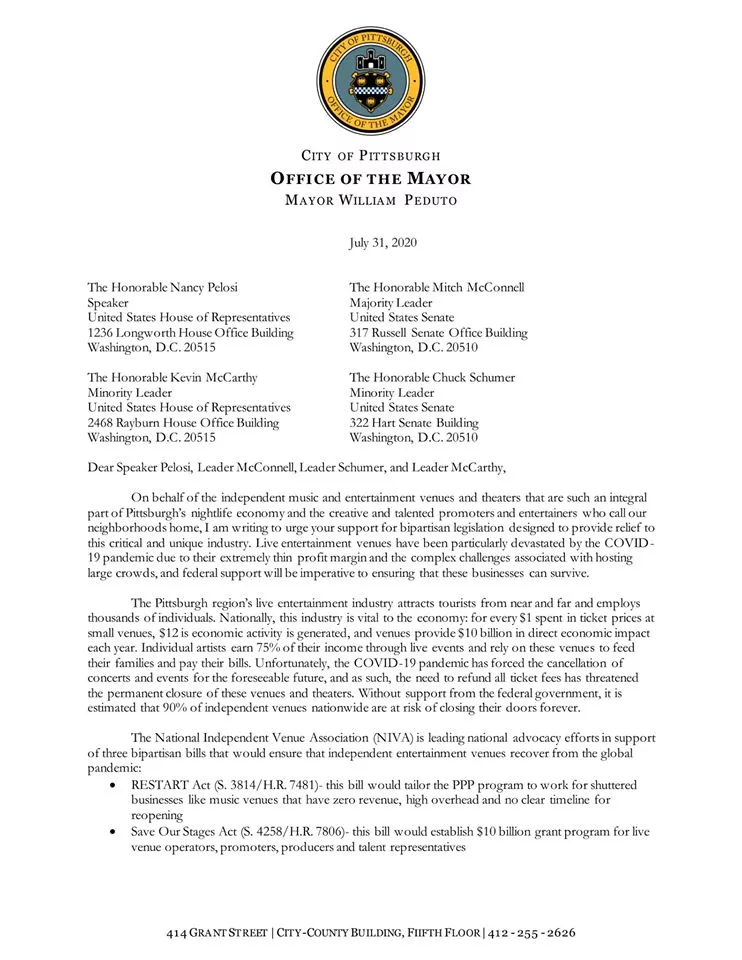 Over the past few months, Pittsburgh concert promoters and independent venues have been working together as part of the National Independent Venue Association (NIVA) to push congress to pass bills that would offer relief to venues and theaters in danger of closing permanently due to the pandemic. Now, Mayor Bill Peduto has joined the efforts by issuing a letter to congress in support of the NIVA and the bills.