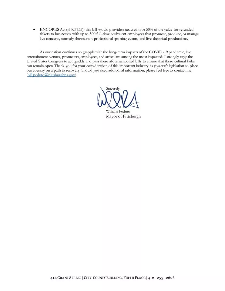 Without help, an estimated 90% of independent venues across the country could close their doors for good. This could cause economic loss in the city and negativity affect local artists who rely on Pittsburgh venues to showcase their skills and grow. Peduto’s letter outlines the economic value and contributions of Pittsburgh venues and theaters prior to the pandemic. “Our independent venues and theaters aren’t just important because of their economic impact. Art, music and entertainment are historically woven into the rich cultural fabric of Pittsburgh,” says Peduto. “There’s no price you can put on their cultural value for our neighborhoods and our city, but there is price we can put on making sure they don’t go under. I’m urging congress to ensure that our local venues are included in and protected by relief packages. They’re what make our neighborhoods great and, frankly, they’re what make Pittsburgh Pittsburgh.”
