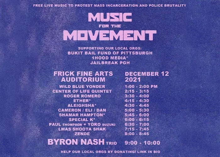 Music for the Movement will take place on Sun., Dec. 12 from 1-10 p.m at the Frick Fine Arts Auditorium. Featured musicians include Wild Blue Yonder, Center of Life Quintet, Roger Romero, Ether, Aleighsha, Cameron/Eli/Dan, Shamar Hampton, Special K, Paul Thompson and Yoko Suzuki, LMAS Shoota Shak, Zende, and the Byron Nash Trio.
