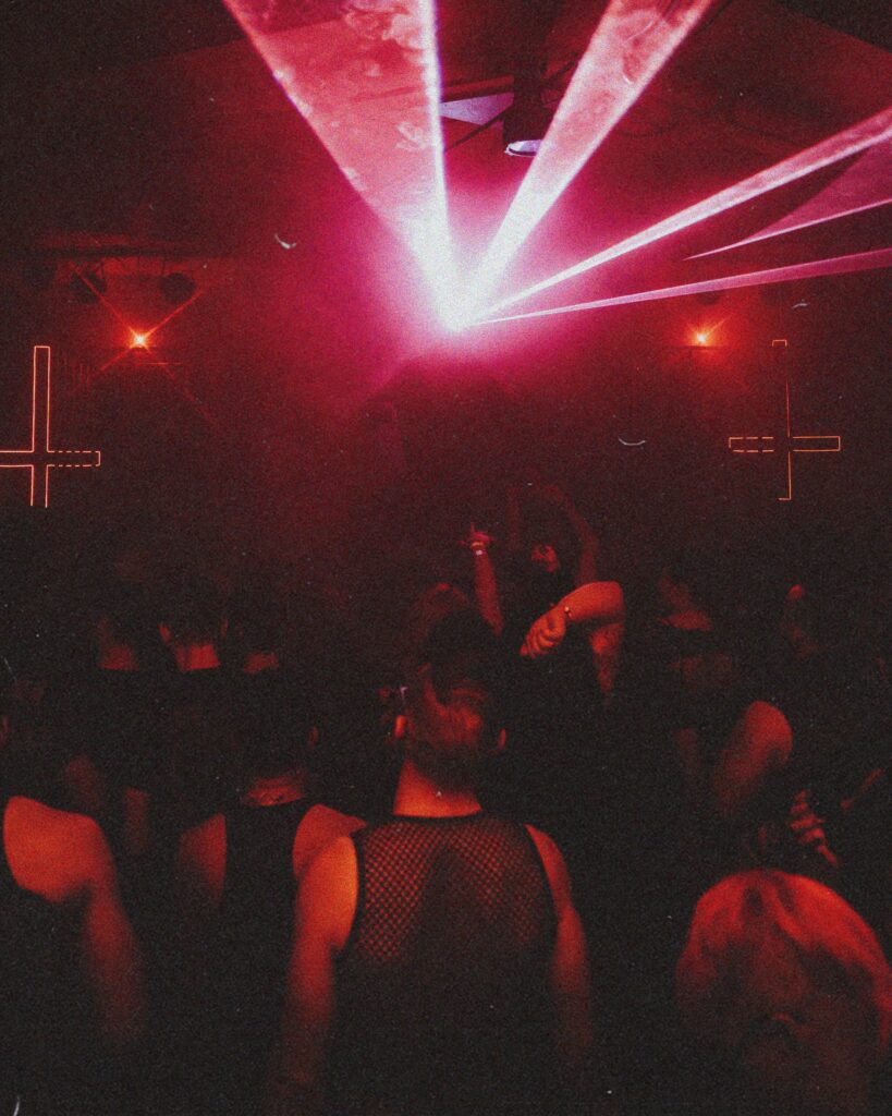In order to unleash this entity upon the world, Morgan and Balderose knew they needed to give NOWHERE2RUN its own “universe to live in.” Bloodrave is that very domain: a bass-heavy, leather-clad, sci-fi horror dance party directly inspired by the iconic rave scenes in action flicks such as Blade and The Matrix Reloaded. The production, entirely designed by Morgan and Balderose, includes gothic go-go dancers in cages, mesmerizing visuals projected behind the DJs, and a labyrinth of ceiling-to-floor sheets cordoning off the dancefloor to encase the audience in NOWHERE2RUN’s neo-noir chamber of reverie.