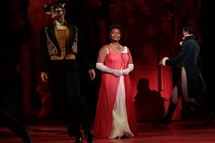 The combination of minimalist scenic design by Tim Mackabee and impressionist projections by Akhila Krishnan offers sweeping interior and exterior views of classic Russian architecture. It serves to frame Charlie Sutton’s choreography, an amalgamation of ballroom and hip-hop typical of 21st-century renditions of post-Hamilton period musicals.